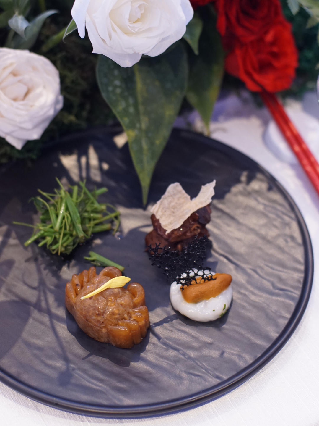 河塘小景有四个景别,两只2两半的熟醉母蟹拆出做成螃蟹形状的冻,蟹黄放在牡丹虾塔塔上,九曲红梅熏制酱鸭,最后吃凉拌辣木苗清...