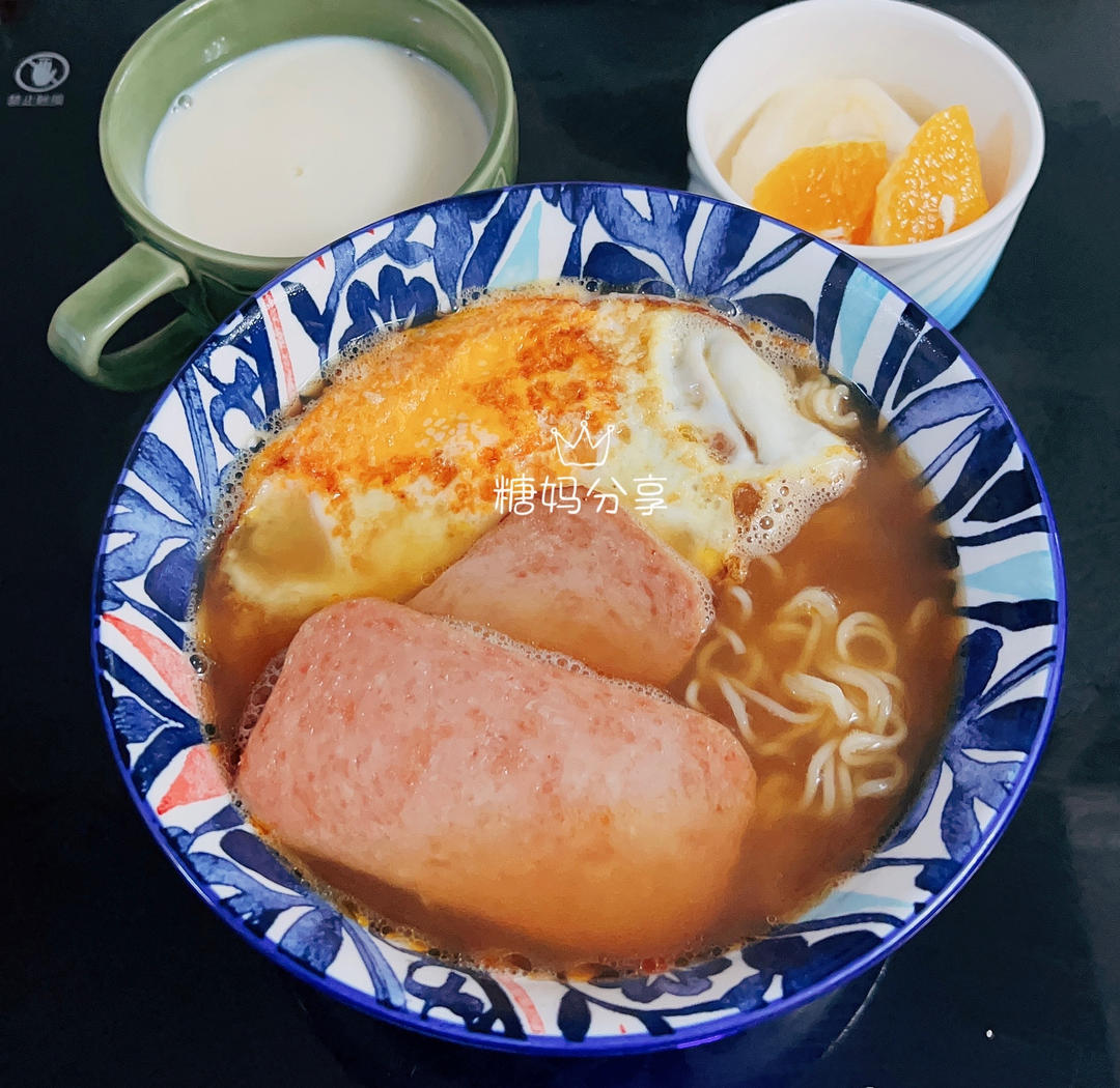 午餐肉番茄鸡蛋米线,苹果...