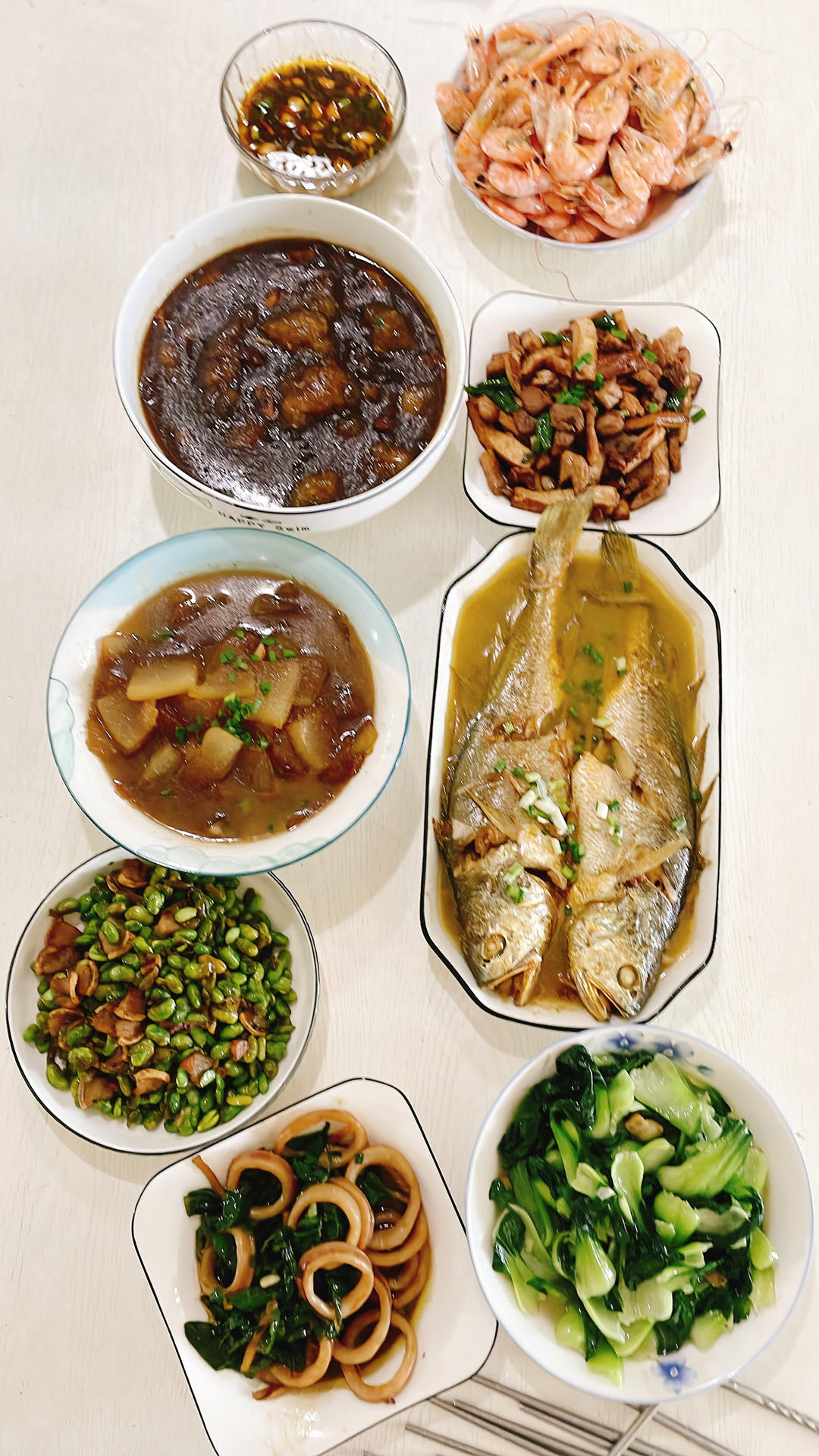 辣子鸡四季豆,鱼丸鲫鱼汤,白菜炒鸡蛋