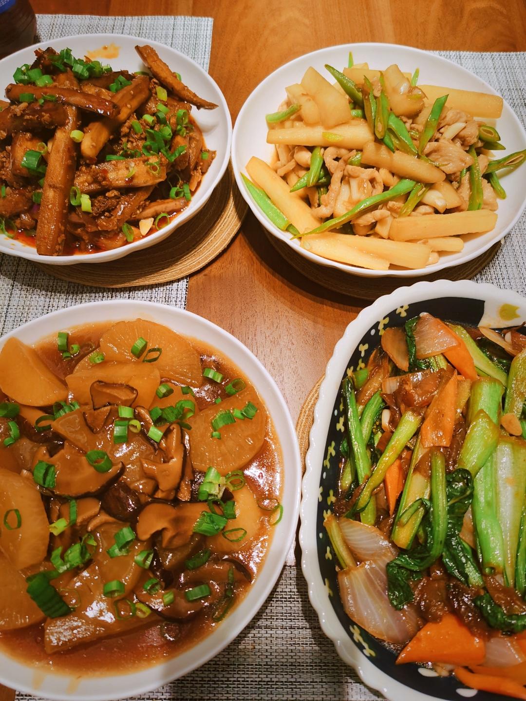 鲍汁萝卜、山药炒肉、肉沫茄子、素炒菜心