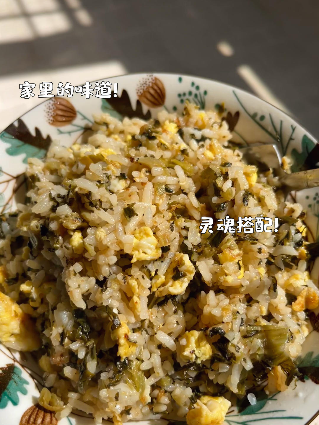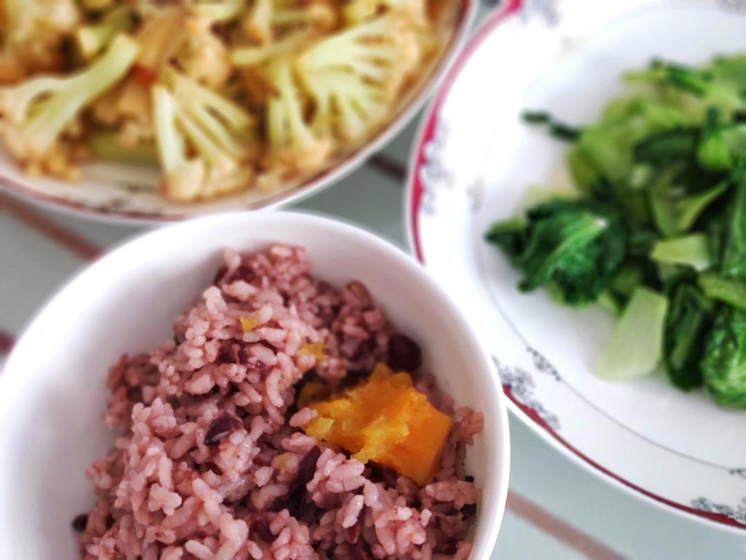炒油菜、肉沫炒菜花、地瓜杂粮饭。