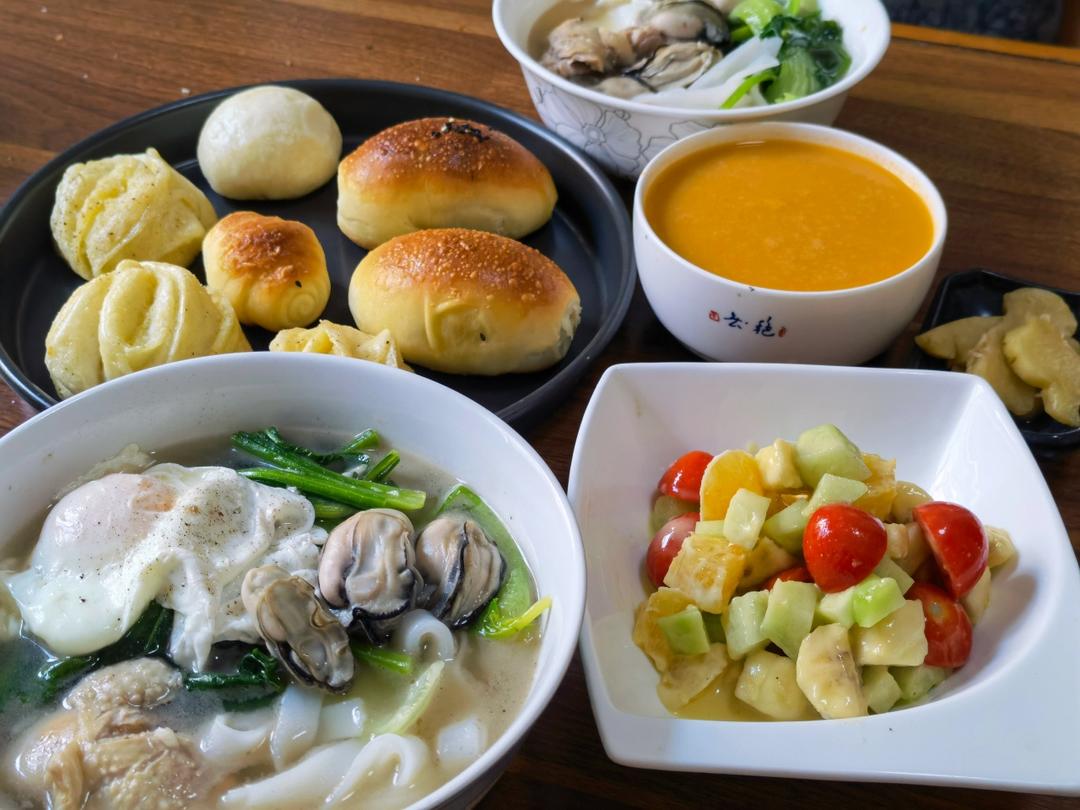 生蚝蔬菜汤粉、蔬果沙拉:圣女果、佛手瓜、甜橙、香蕉;什锦绿豆沙(绿豆,胡萝卜,芹菜声,香梨);红豆面包、椰蓉小花卷、小馒...