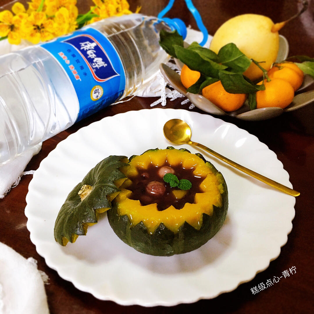 漂亮的南瓜🎃盅装的是用康师傅饮用纯净水煮的红豆黑米粥,香甜浓稠,美胃可...