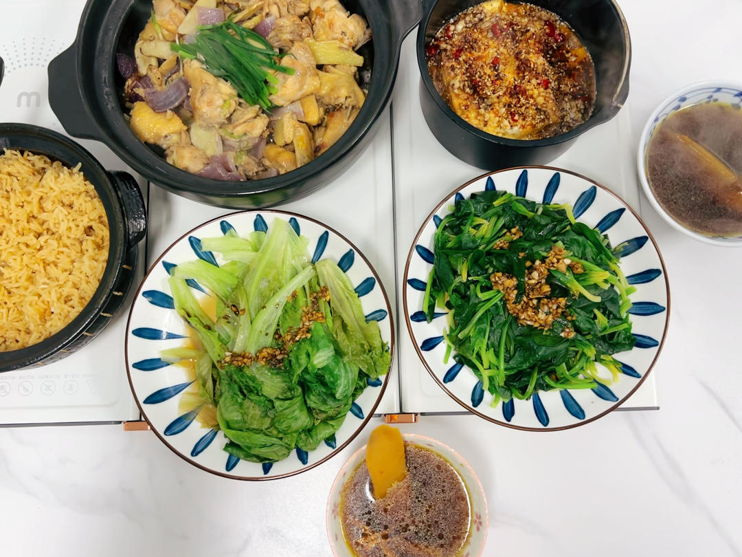 沙姜焗鸡、空气炸锅烤豆腐、白灼生菜、蒜蓉菠菜、鸡汤砂锅饭&虫草花鸡汤