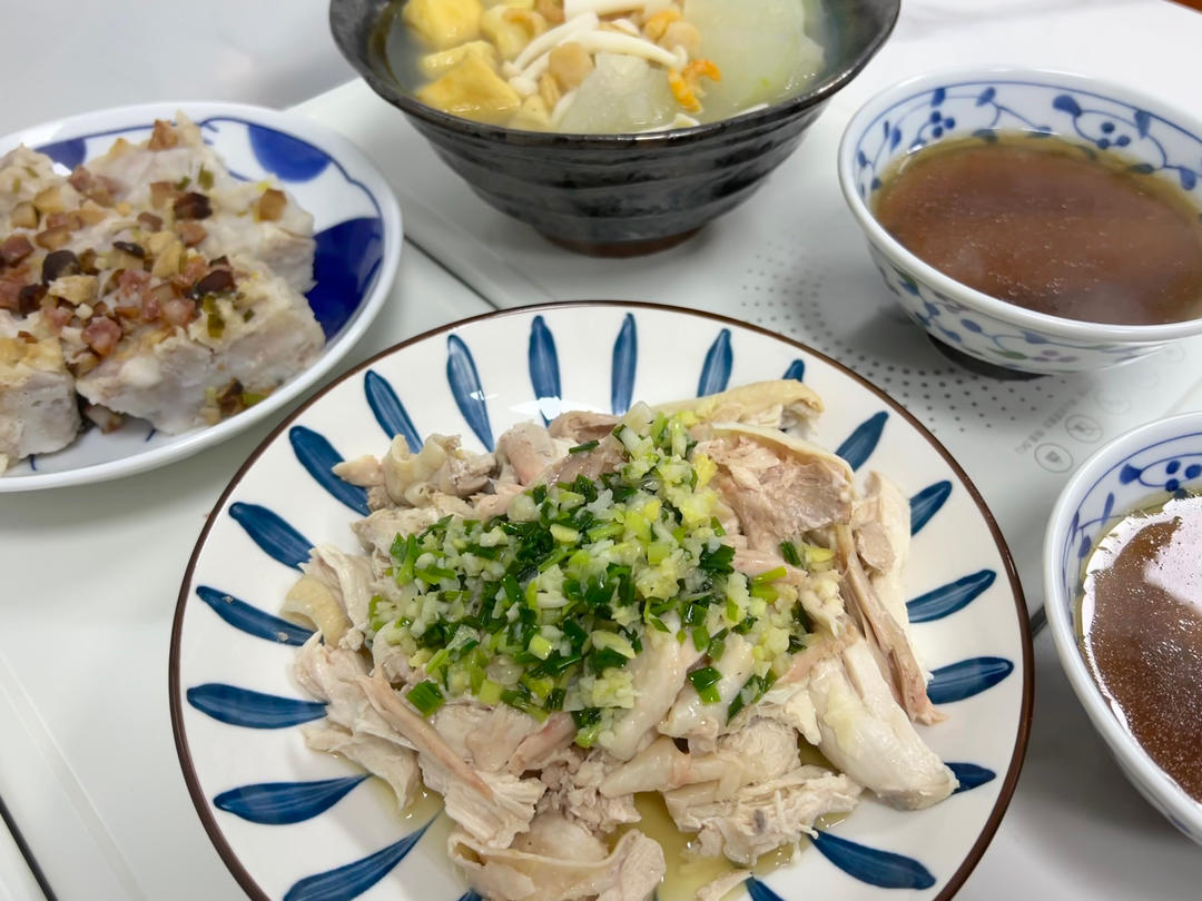 芋头糕、葱姜手撕鸡、冬瓜白玉菇&土茯苓无花果石斛淮山鸡汤~