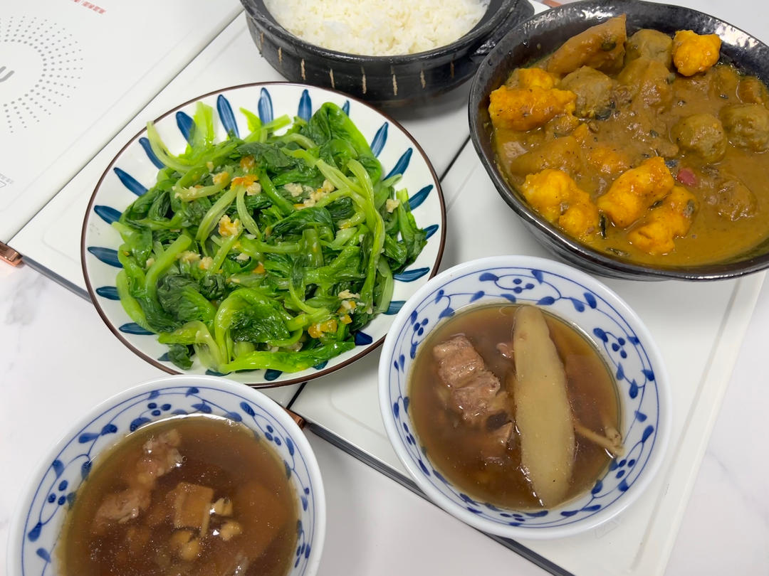 海陆咖喱大乱炖、蒜蓉灯笼椒生菜苗&猪骨汤