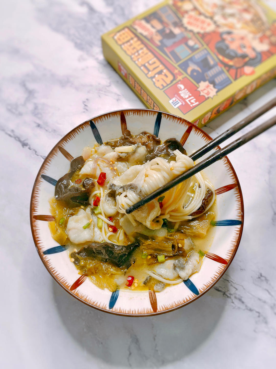用葱姜蒜煸炒了一下酸菜,再加木耳,木耳很适合放在汤里~这款老坛酸菜鱼不算辣,而且不咸,不需要调味很方便,自己加了点辣椒,...
