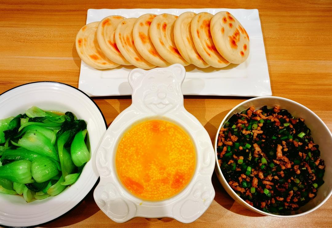白吉馍夹肉沫外婆菜,炒上海青,南瓜小米粥!