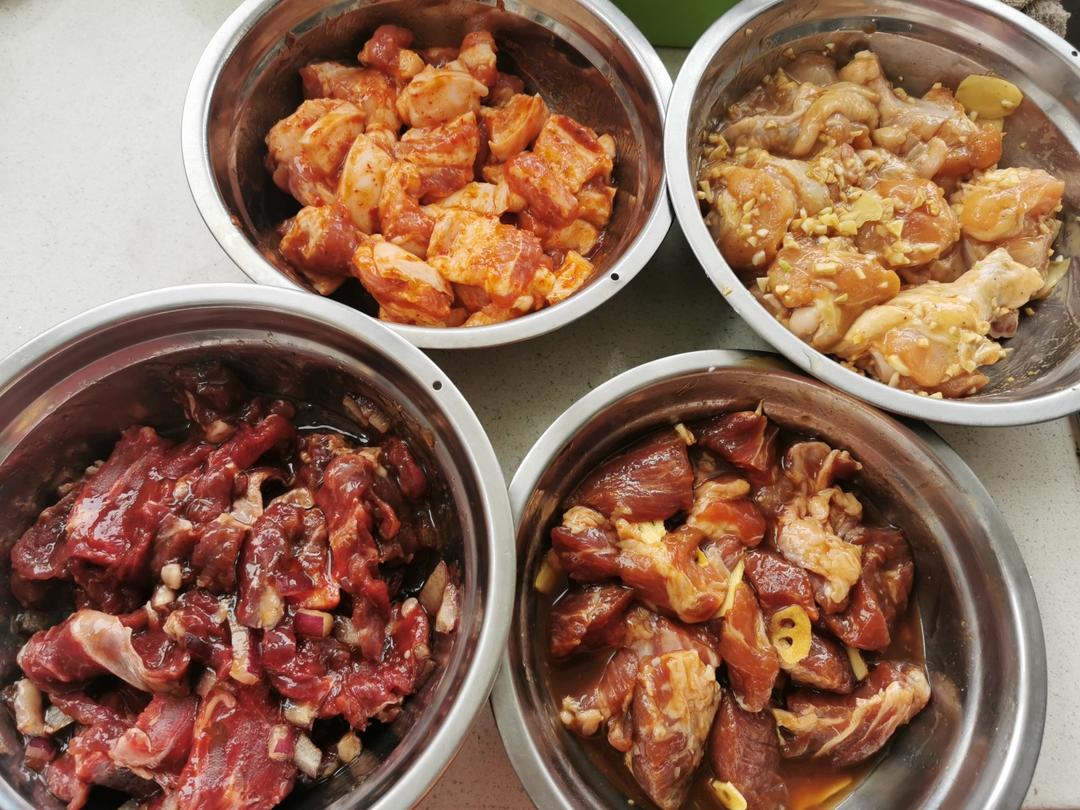 自家户外烧烤准备的食材。梅肉直接切块,没加叉烧酱,蜂蜜换成了麦芽糖,做成蜜汁的。牛里脊和五花肉用的直接买的烧烤酱,鸡翅按...