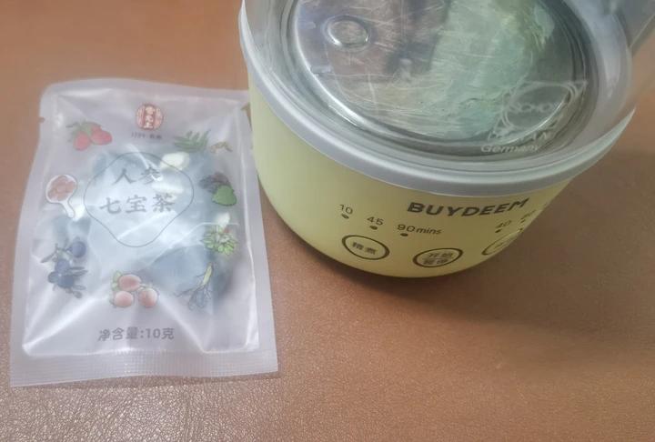 人参七宝茶。昨晚睡的不好,在办公室泡一个人参七宝茶。用的买好的茶包,里面有人参片,桑葚等7种材料。丢到北鼎的迷你养生壶,...