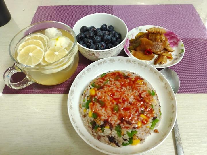 早餐•鸡丁蔬菜炒饭 什锦咸菜 柠檬蜂蜜水