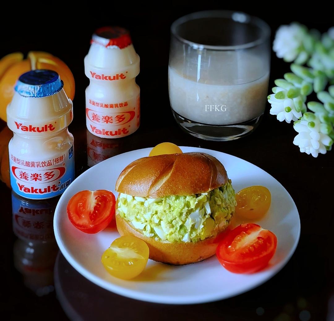 鸡蛋酱贝果汉堡真不错,吃完喝瓶养乐多,助力肠道健康快乐多。