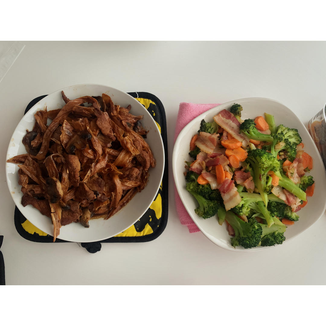 腐竹蘑菇炒猪肉+培根西兰花~