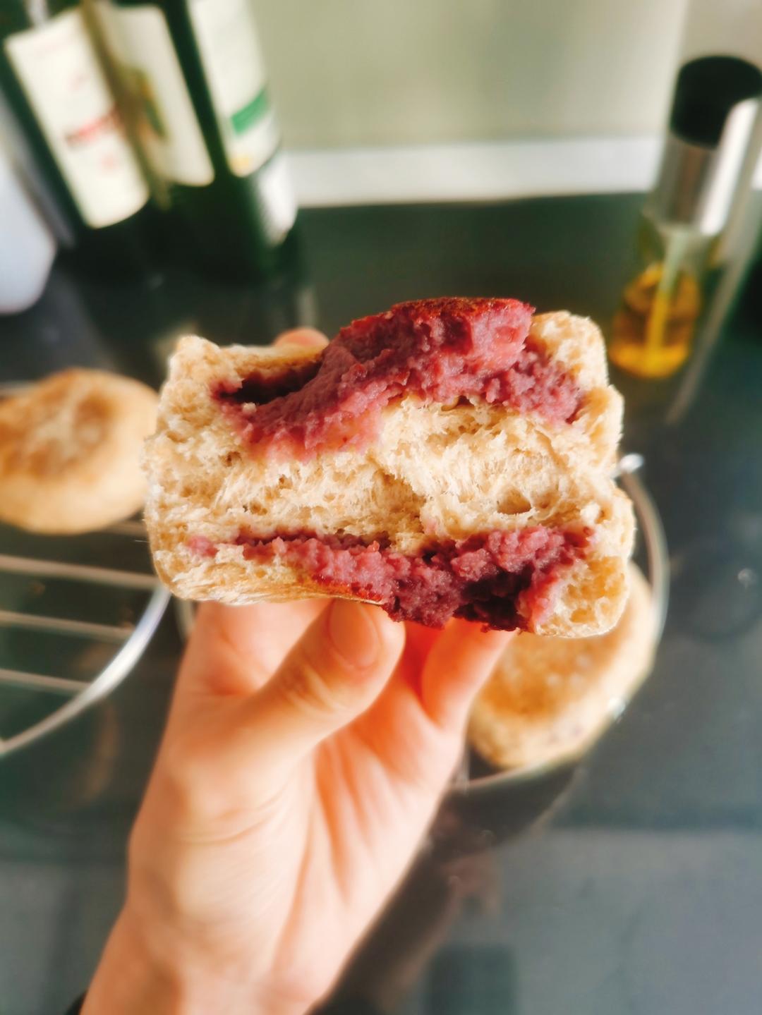 做了紫薯红豆馅,用牛奶和了面。一个饼里谷薯杂豆,蛋奶坚果都有了。