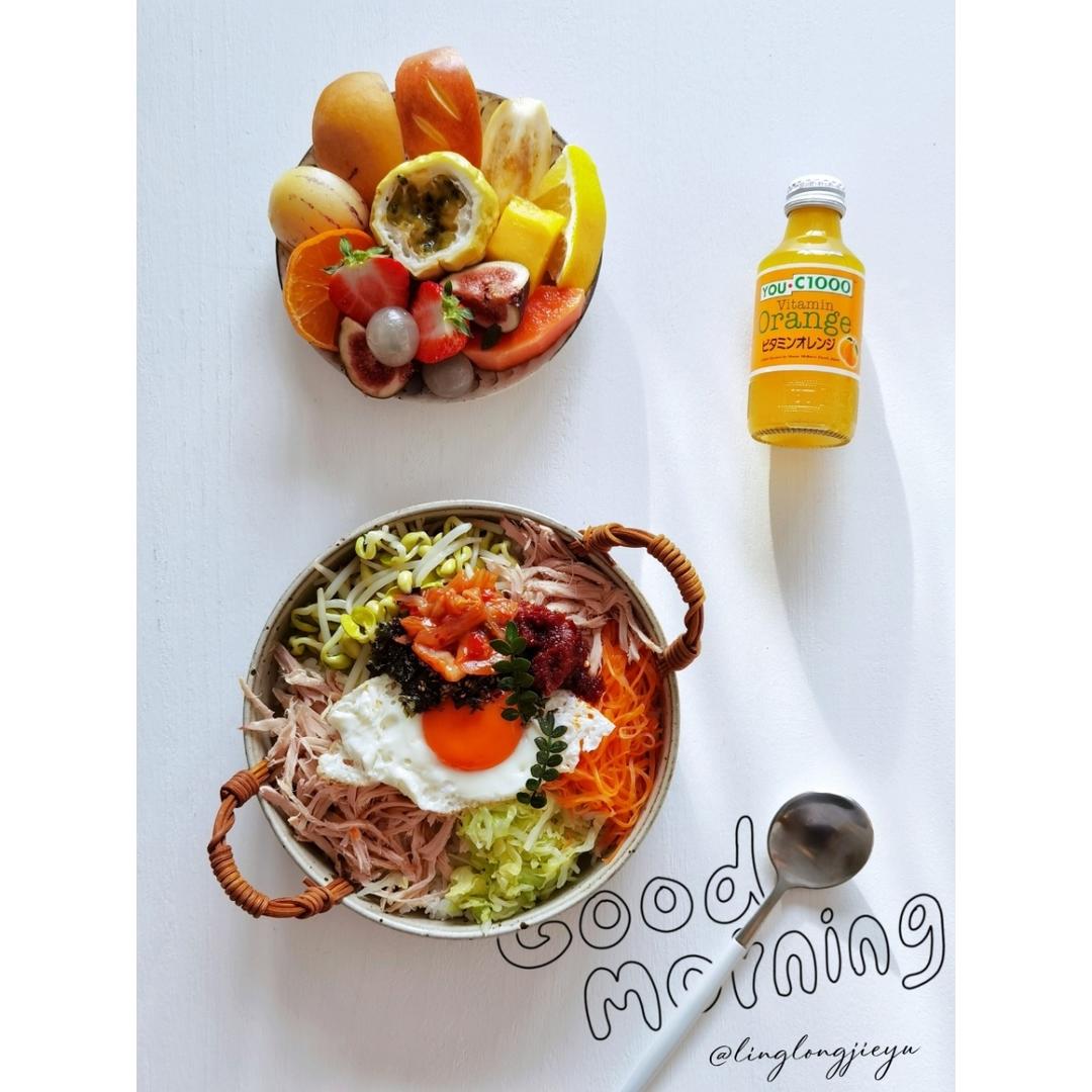 韩式拌饭,水果,橙汁