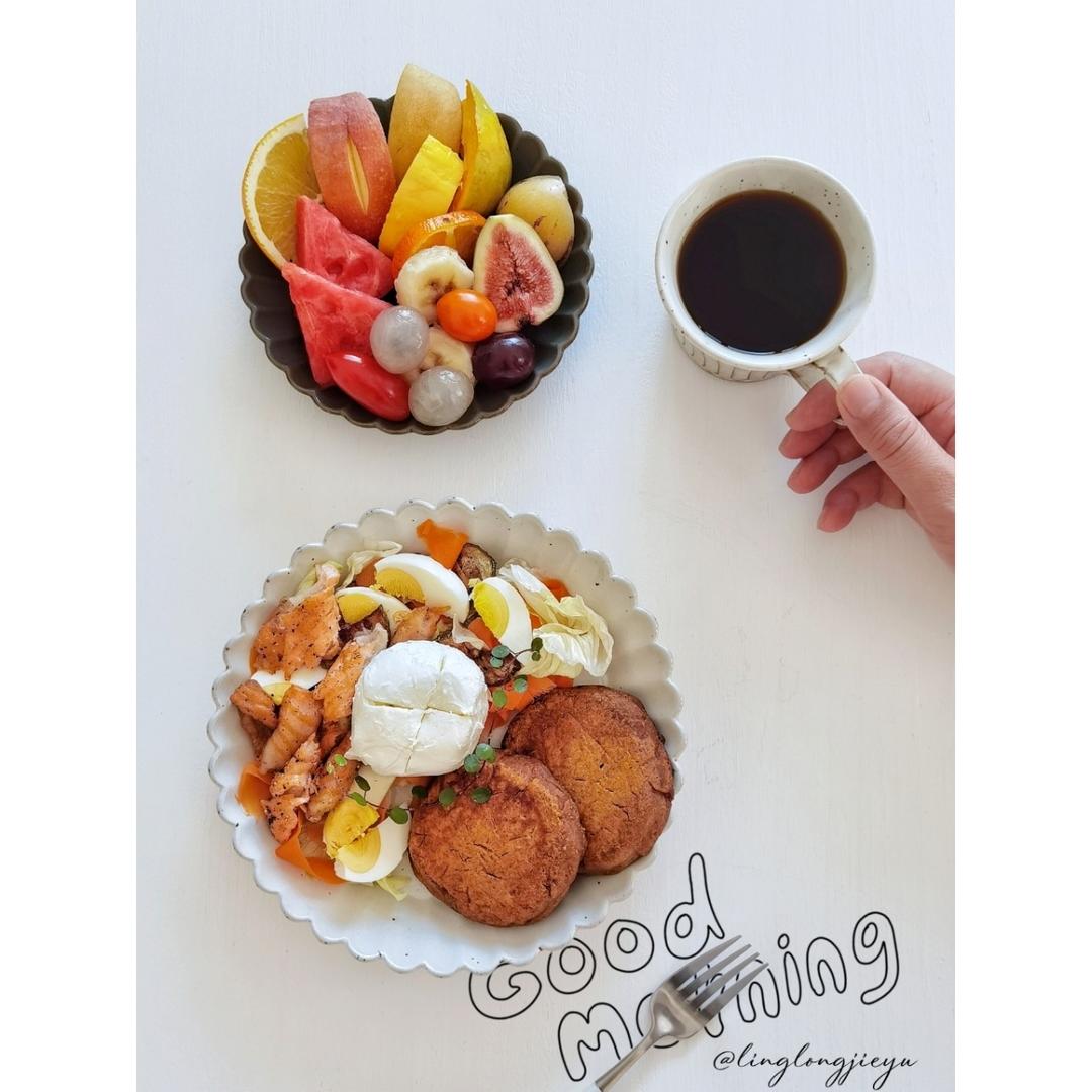 沙拉&杜嘉薇塔水牛球,南瓜红枣杂粮饼,水果,手冲☕️