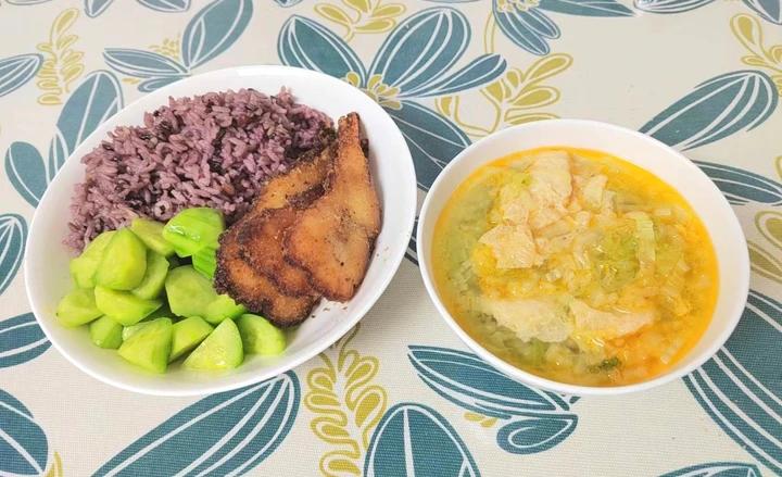 虾排,黄瓜,糙米饭,虾油白菜汤