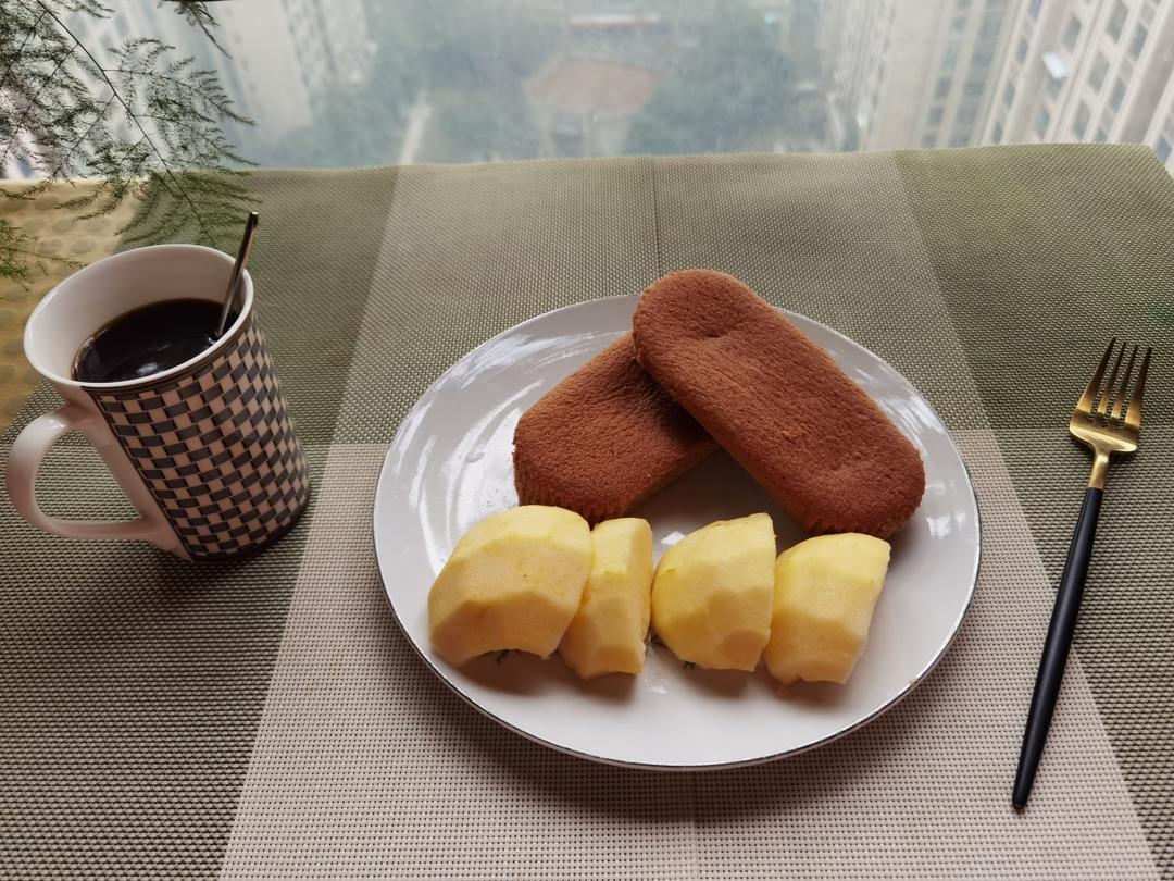 【早餐心语】不管处于什么样的状态,都要明白,生活的目的是健康快乐。 自制可可海绵蛋糕、黑咖啡、苹果。#早餐•202...