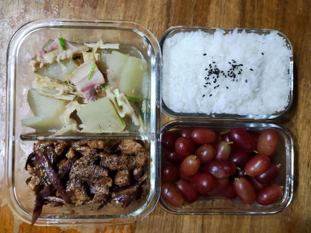 陈果果带便当的第四十一天,晚餐:黑胡椒洋葱梅头肉+咸肉笋干烧冬瓜+克伦生红提。等娃晚上回...