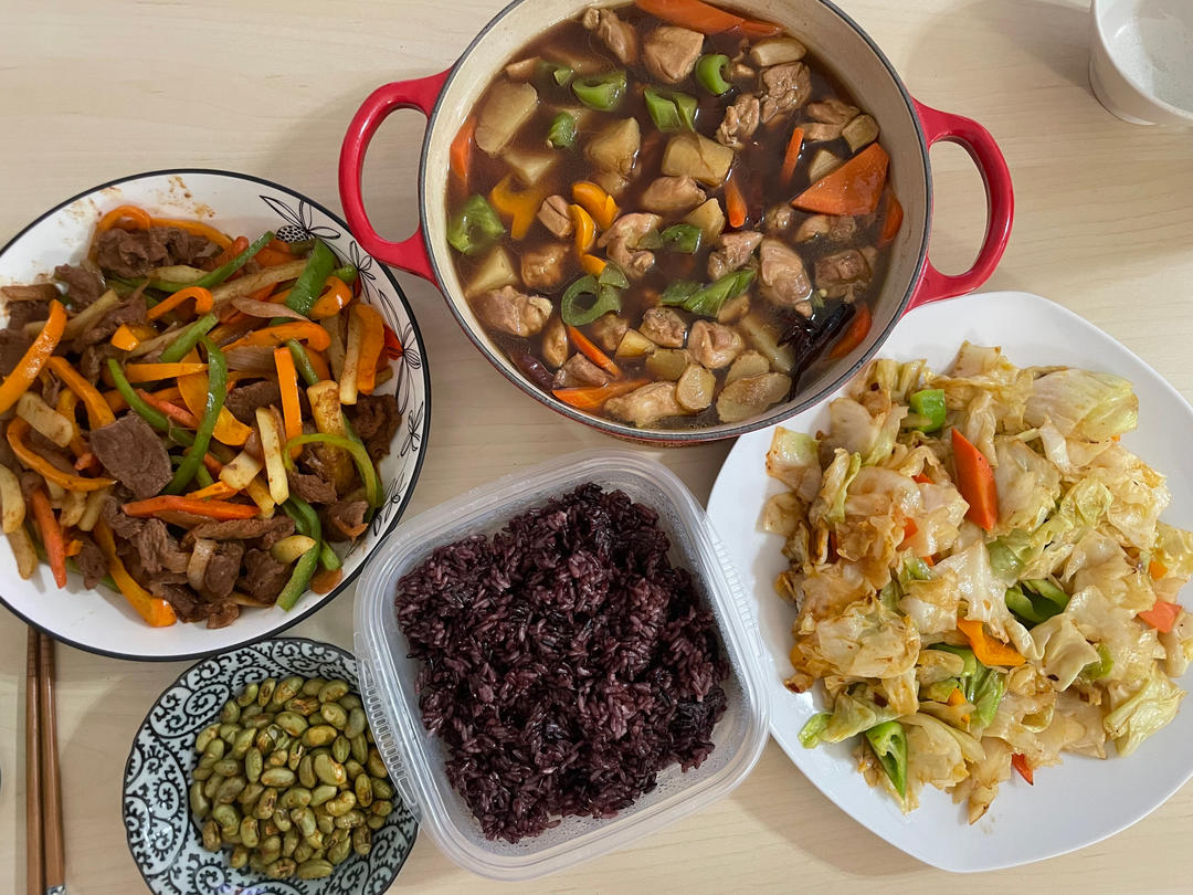 鸡肉炖土豆,炒烤肉,手撕包菜