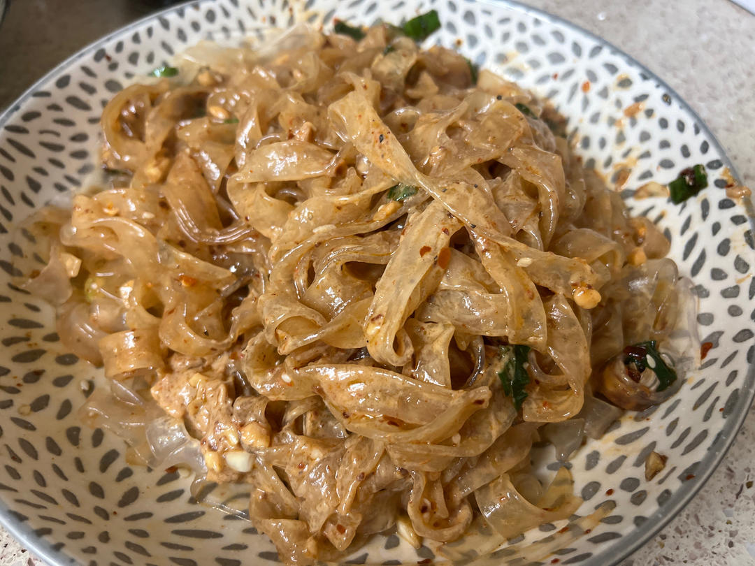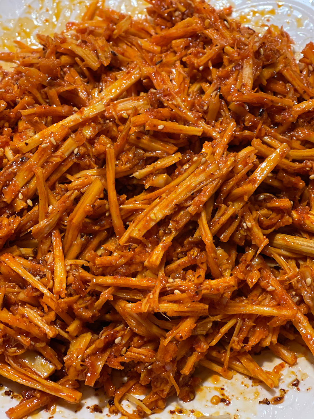 用韩国辣酱加泼过油的姜蒜泥芝麻辣椒碎加糖拌的麻辣牛板筋是儿子的最爱