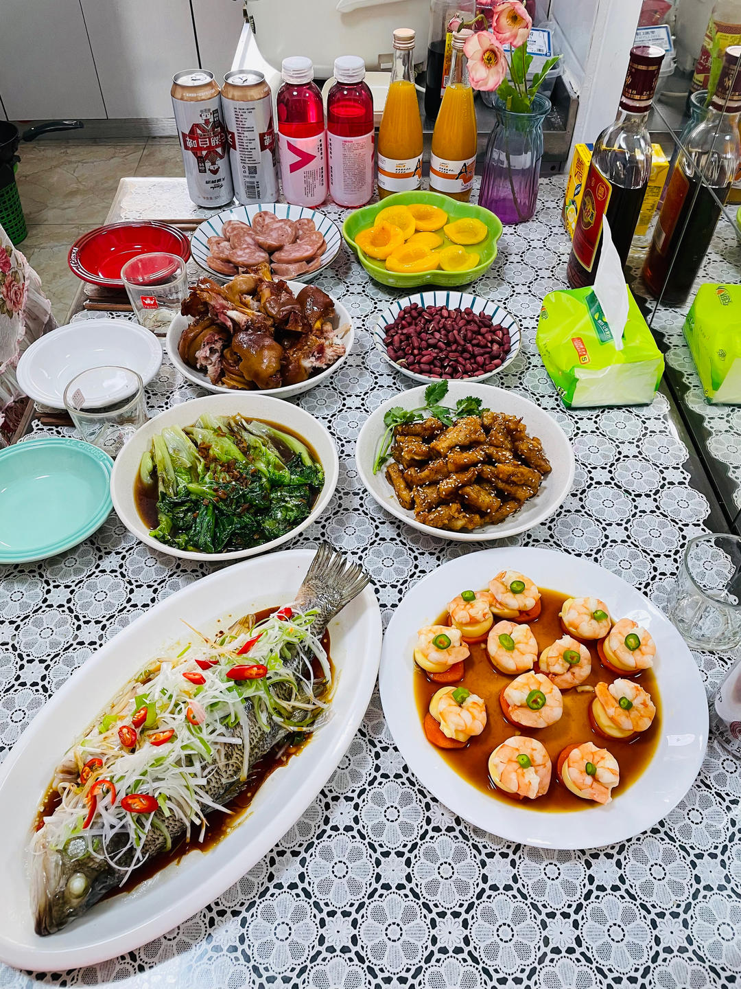 🧨年夜饭:清蒸鲈鱼、虾仁🍤豆腐、糖醋里脊、蚝油生菜、卤猪爪、花生米、香肠、黄桃罐头🥫,㊗️亲爱的友友新年快乐🎉🎉🎉#午餐...
