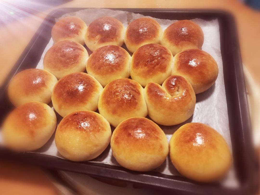 用方子的一半量做了16个小餐包,每个30多克,内包芝士火腿,红豆,肉松条,巧克力四种馅 ,这个方子的含水量高,组织确实更...