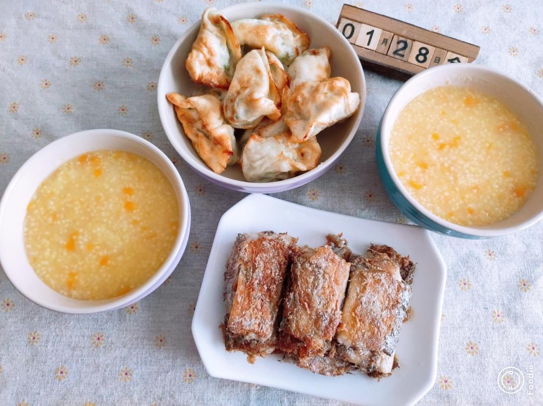 南瓜小米粥,煎饺,煎带鱼。