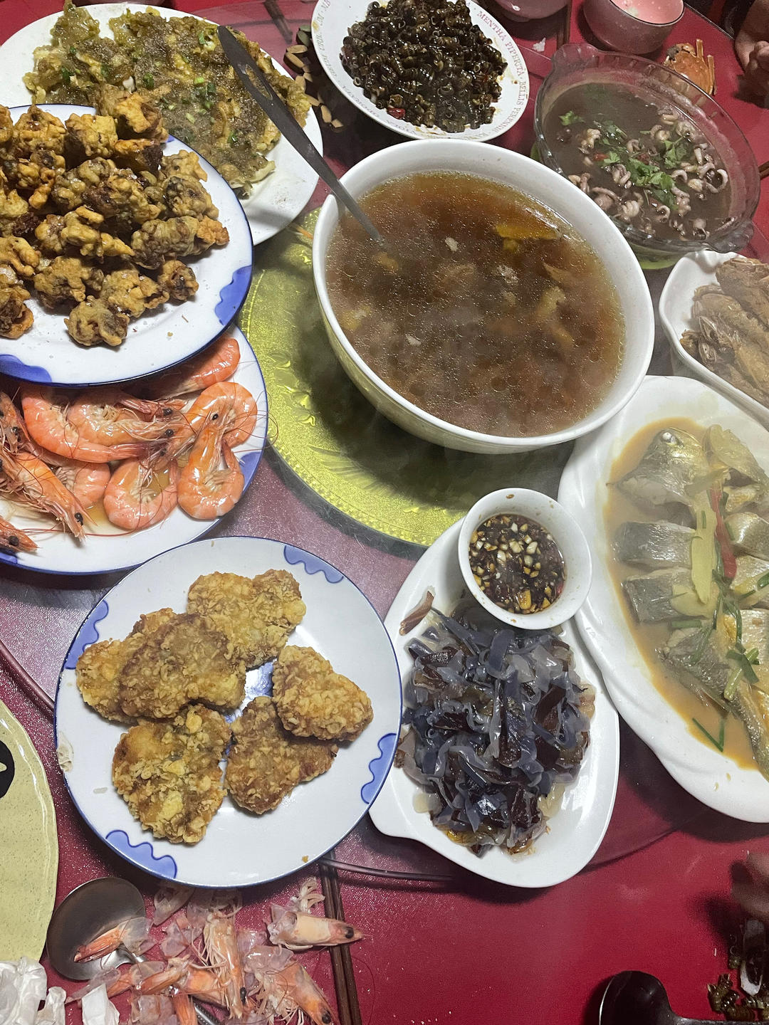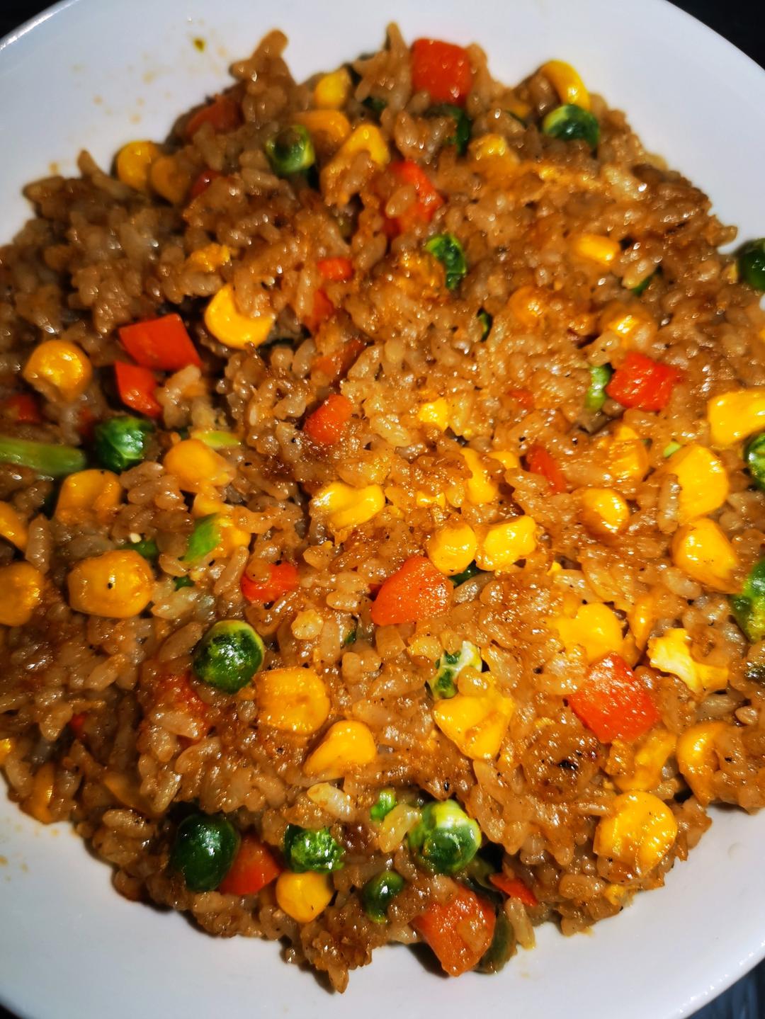 虾头炸的虾油做的炒饭,一开始做的虾油蛋炒饭是红色的,后来又炒了什锦菜炒在一块儿,感觉应该都用虾油做更好吃,生抽应该少放或...