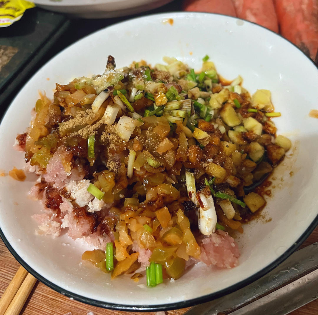 1、虾肉+虾皮剁碎+2、蘑菇一朵/青菜一根/胡萝卜五...