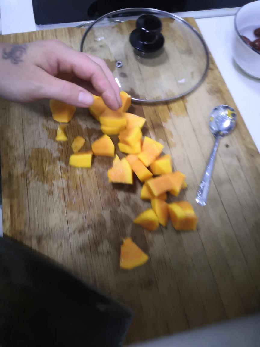 木瓜(可换其他水果),红枣切块,加水煮几分钟,放牛奶再煮几分钟,最后放枸杞
