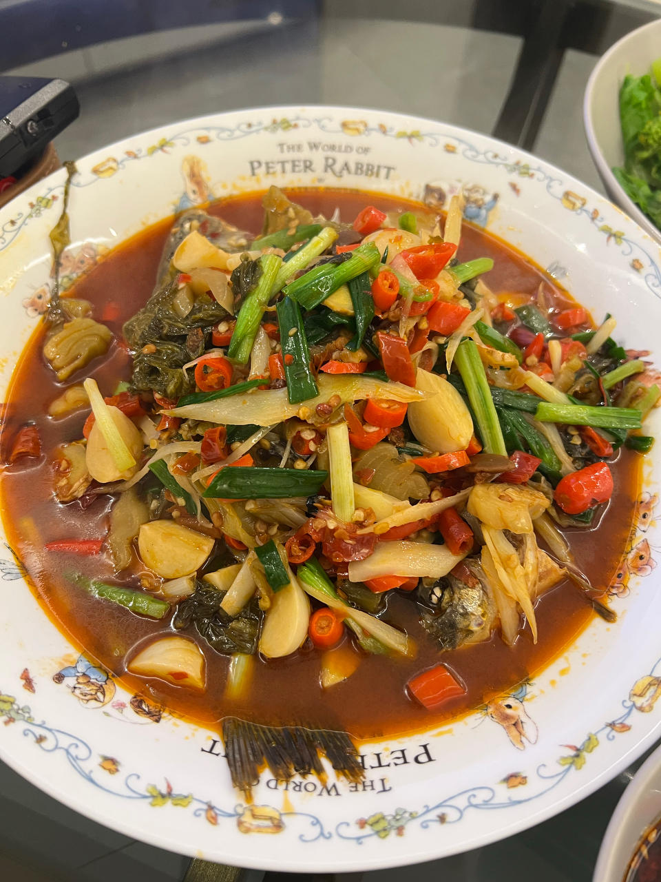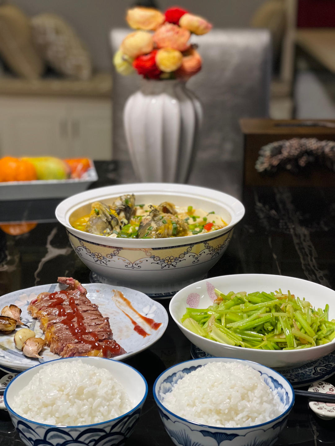 黄刺鱼炖豆腐、清炒芹菜、牛排