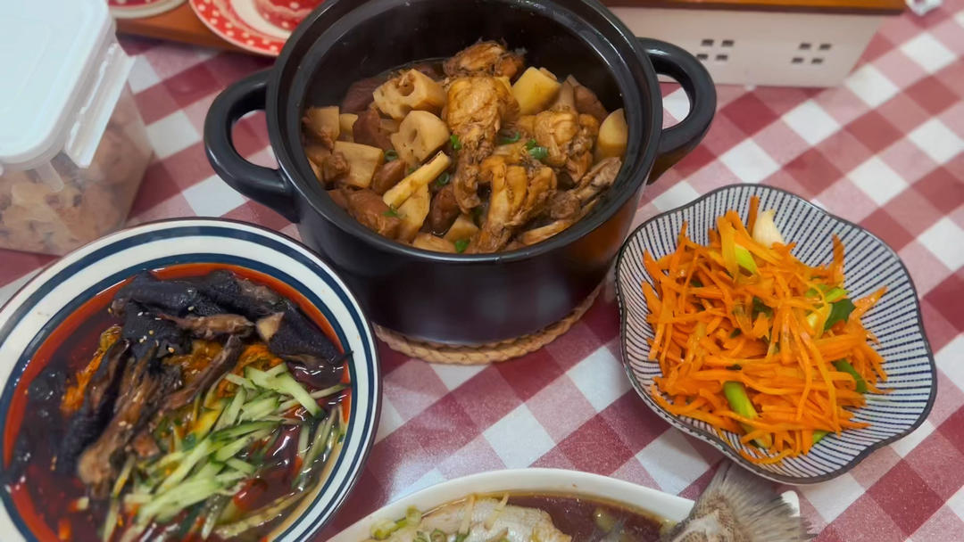 今日午餐:猪肉莲藕烧鸡腿、凉拌鸡爪黄花菜、蒜末炒胡萝卜、蒸鲈鱼。