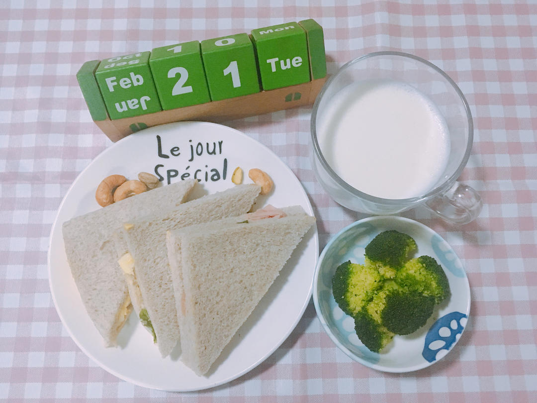 G6S2.W2Day2.金枪鱼火腿鸡蛋🥚芝士🧀三明治🥪搭西蓝花🥦配草莓🍓牛奶🥛佐坚果