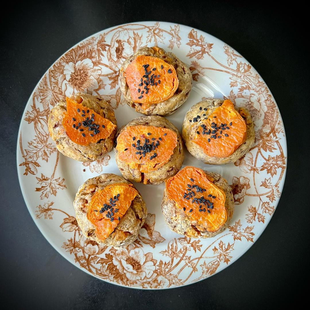 昨天早上多蒸的红薯(质地比较干)顺手拿来做了这款种草已久的司康~红薯保留一些颗粒状,面团里还放了亚麻籽粉,肉...