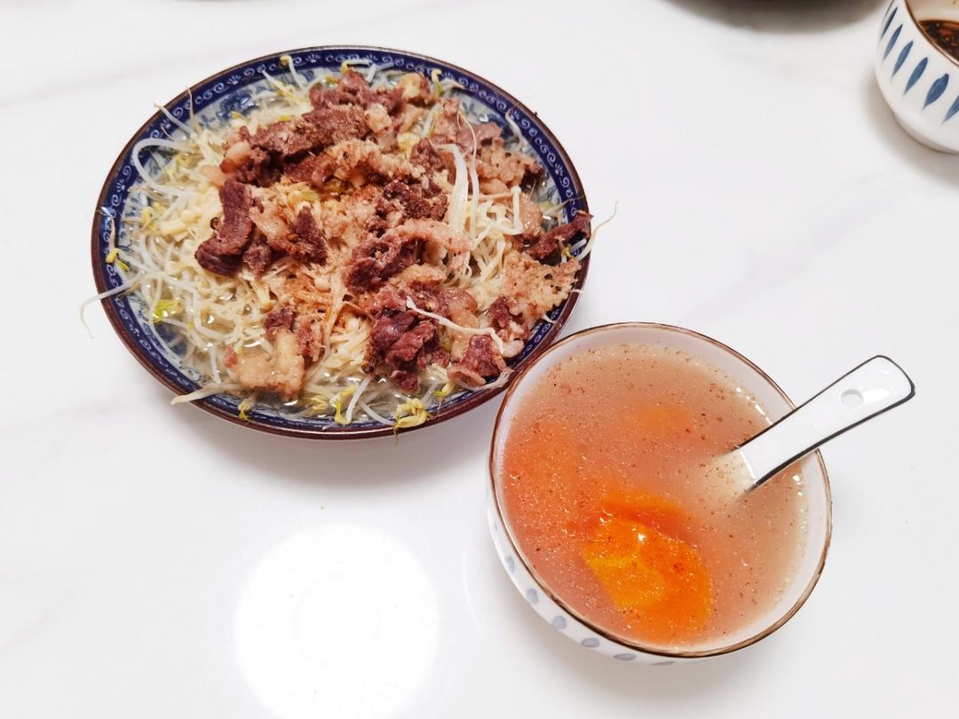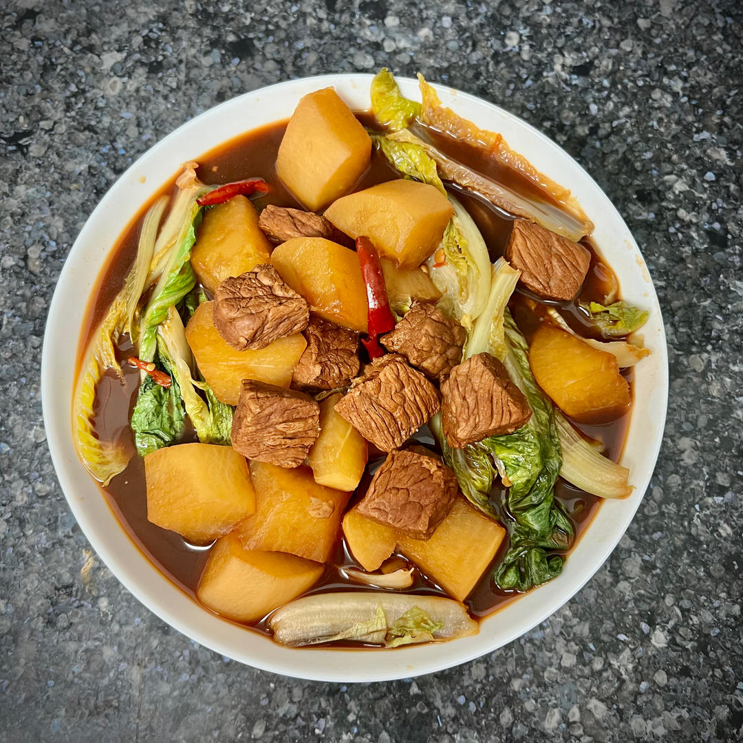 白萝卜炖牛肉,放了干辣椒、料酒、老抽、生抽、十三香、一勺黄豆酱、一勺甜面酱,汤底顺便烫了个生菜😝
