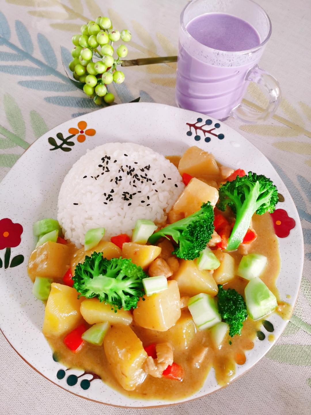 我家妞钦点的咖喱鸡肉饭,按照这个食谱做的,味道很正宗,再配一杯紫薯奶昔,YYDS👍!