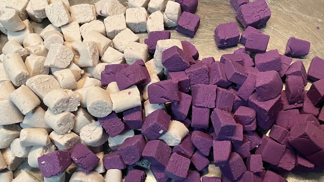 不是很难,就是水量把握不住,前面白色,紫色老是搓条的时候会裂开,一气之下我直接摊开切一...