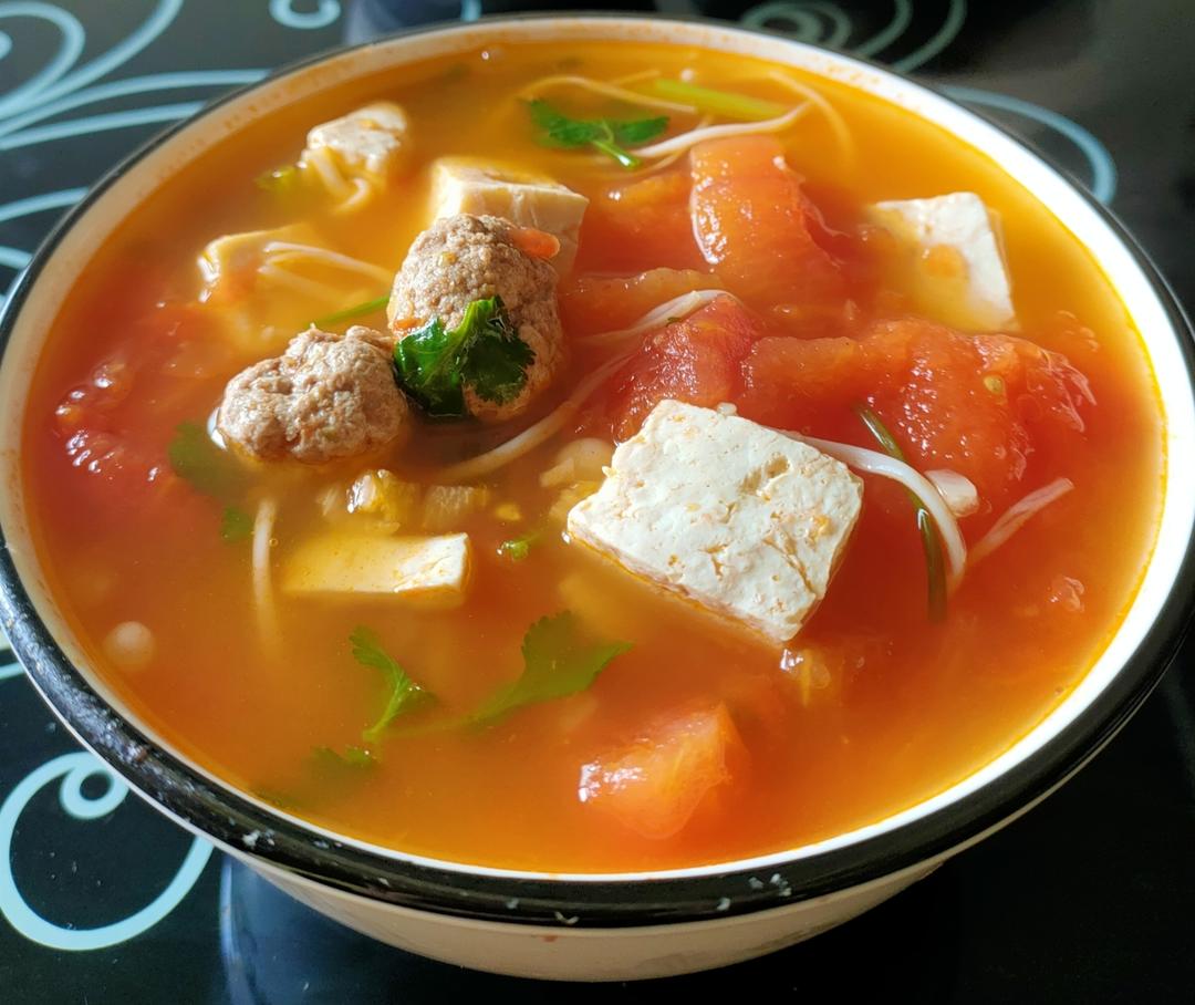 今日份减脂午餐:番茄杂菜汤:冻豆腐,自制牛肉丸,金针菇,用番茄做汤底提味。起锅加点香菜。