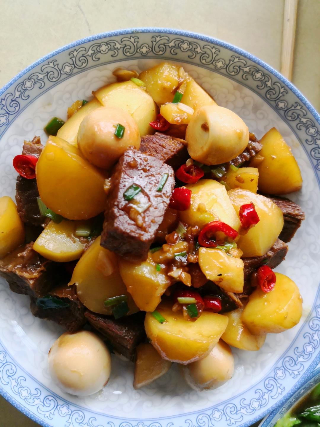 葱香土豆焖牛肉,酸辣肉丝大白菜梗,生菜