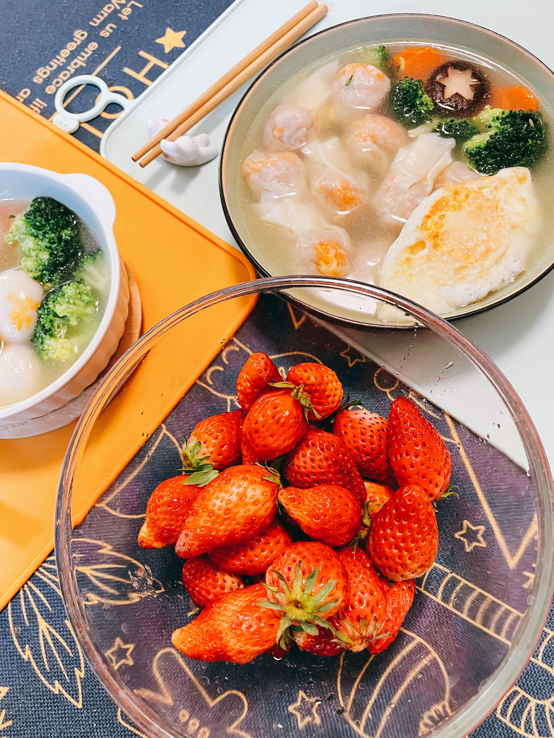 蟹籽虾仁云吞,香菇西兰花胡萝卜煎蛋,美美的草莓🍓周末早餐~