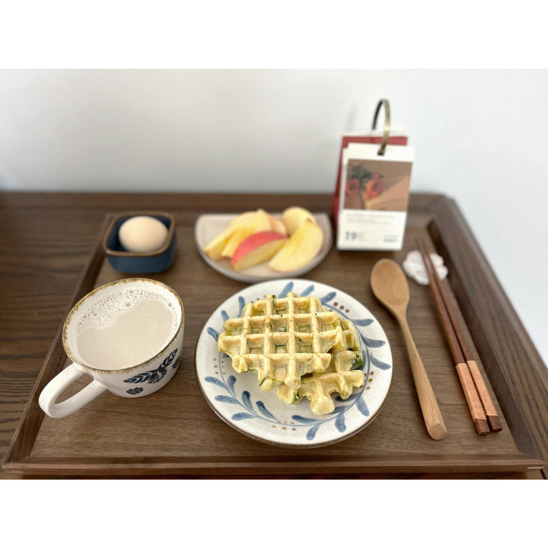 葱油华夫、黑豆浆、鸡蛋、苹果
