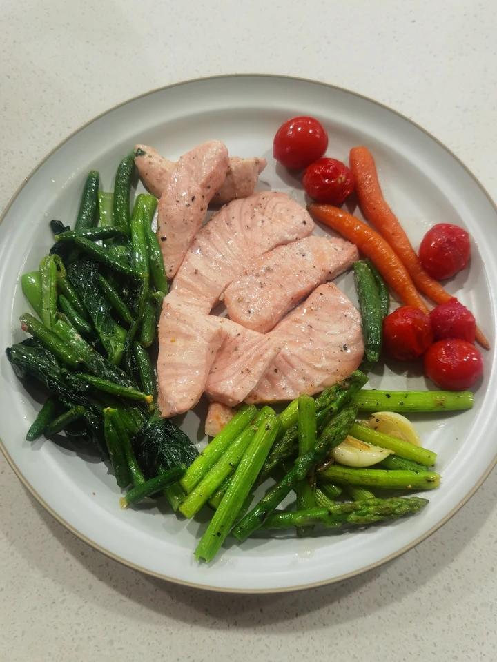 可生食的三文鱼用橄榄油黑胡椒腌制一会儿,双面煎...