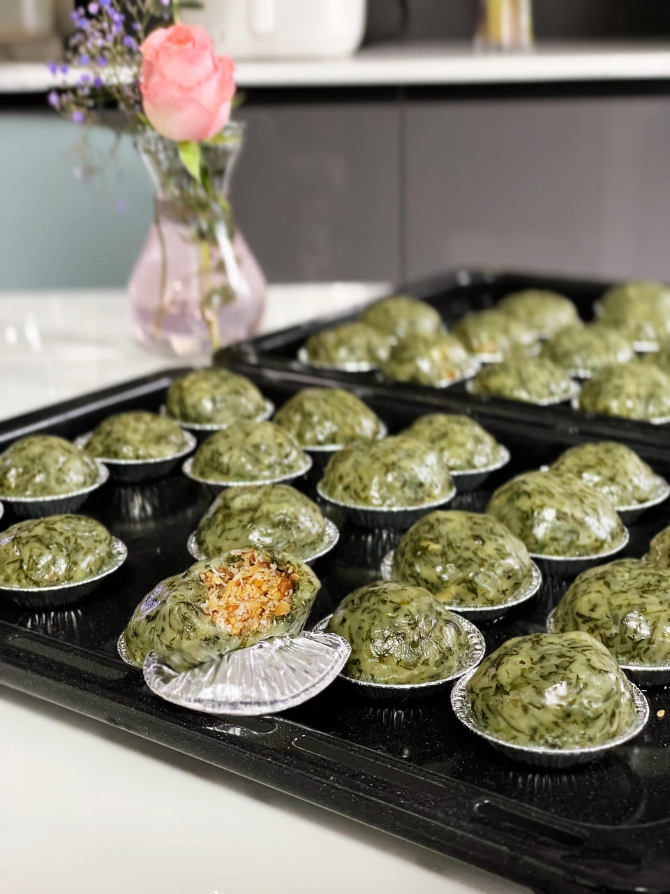 昨晚摘好艾叶打好馅,中午回来包。蒸好马上干掉3个,好饿😁