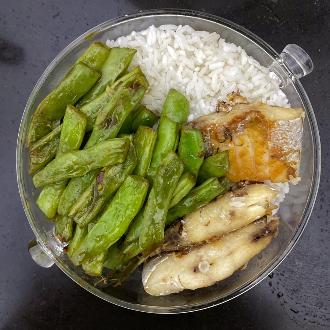 油煸豆角,煎带鱼,白米饭🍚。最后一份带鱼咯。