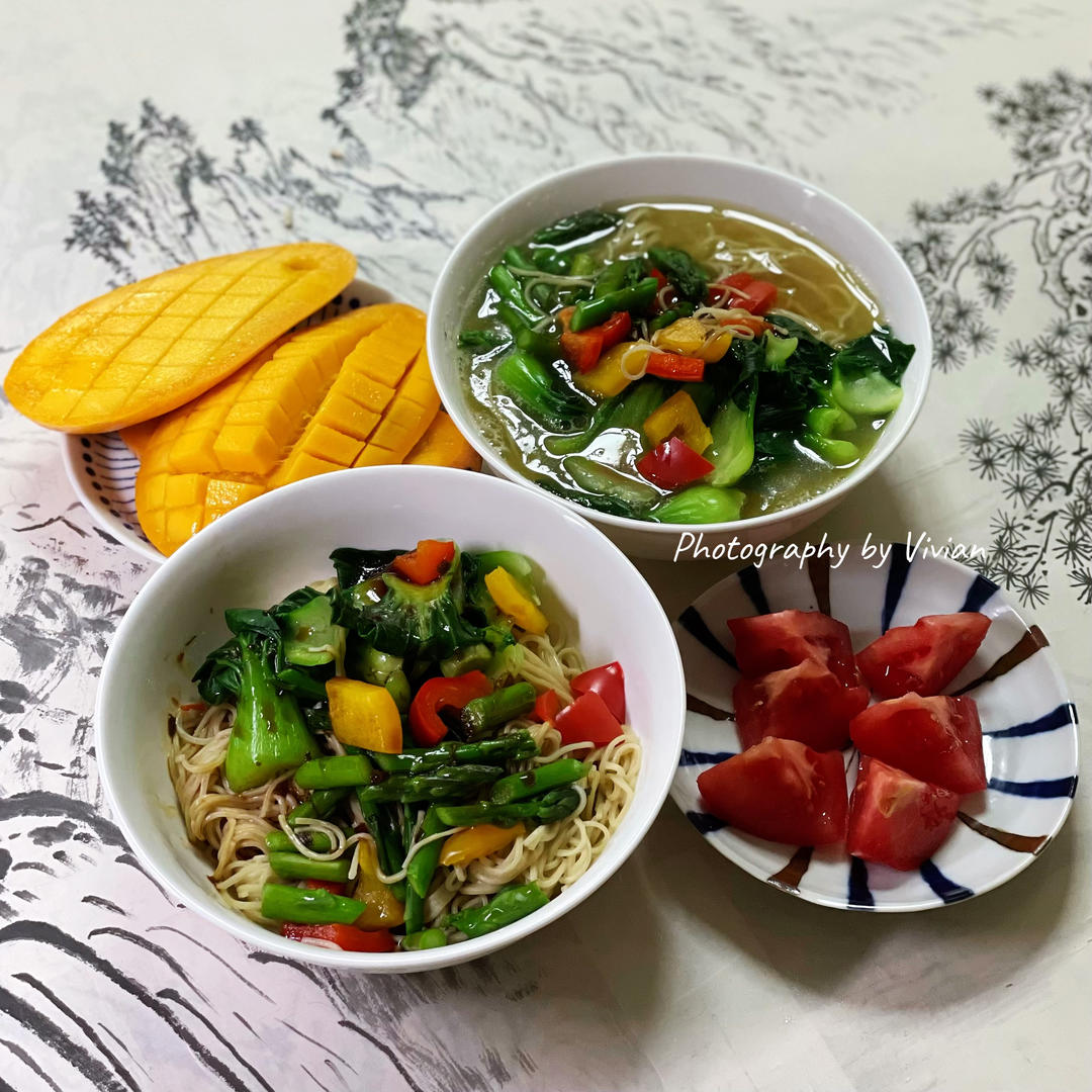 周日轻食午晚餐|时蔬葱油面+粉番茄+金煌芒~🌷