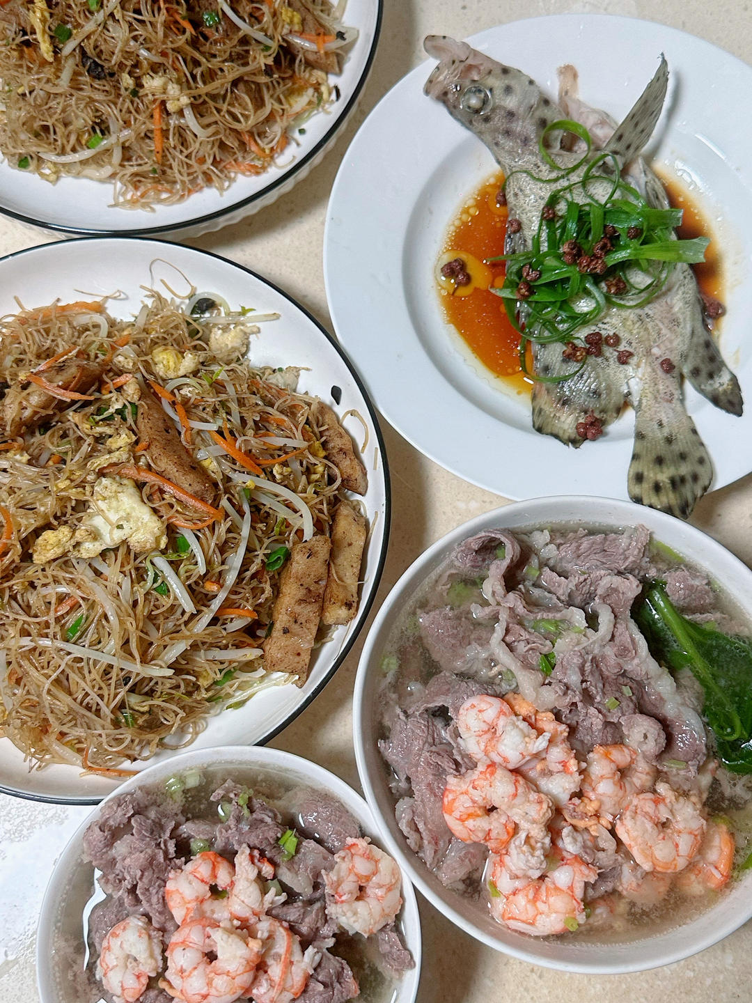 雪花海虾木耳菜汤,榄角炒米粉,老鼠斑