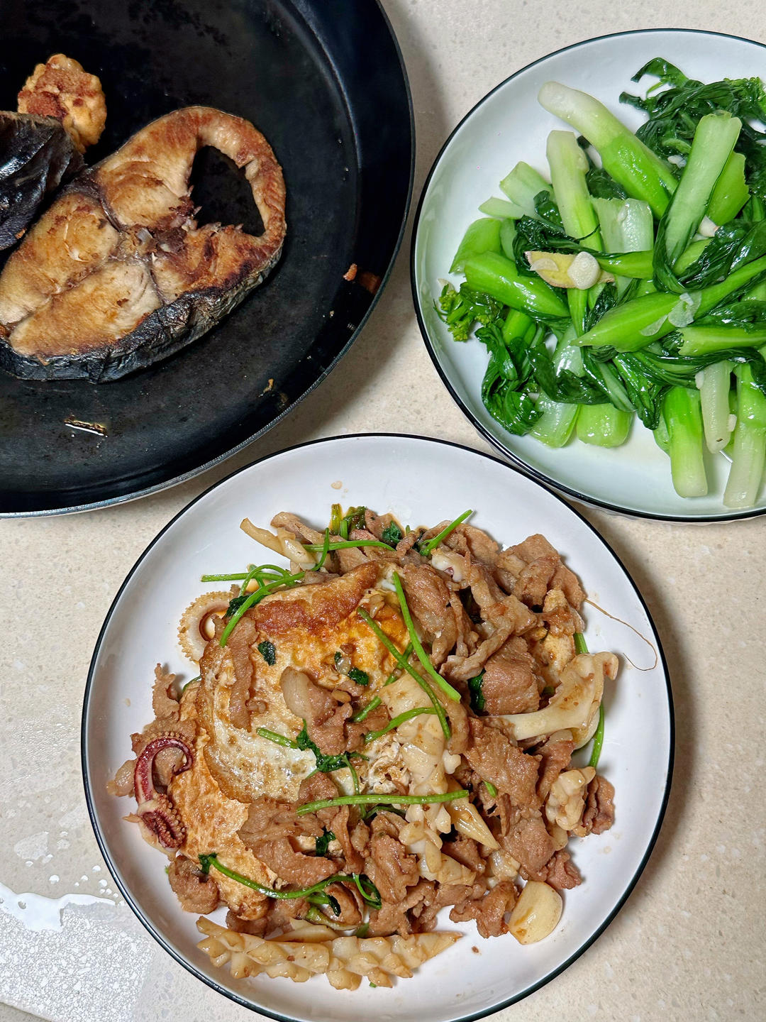 马鲛鱼,酱油煮鱿鱼二层肉鸡蛋,菜心