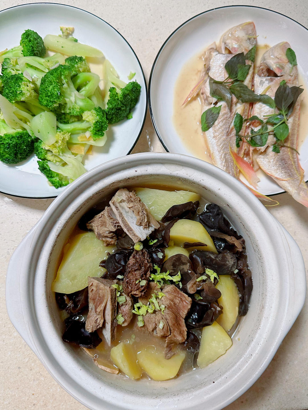 羊肚菌黑木耳土豆扇骨汤,红杉鱼,西兰花