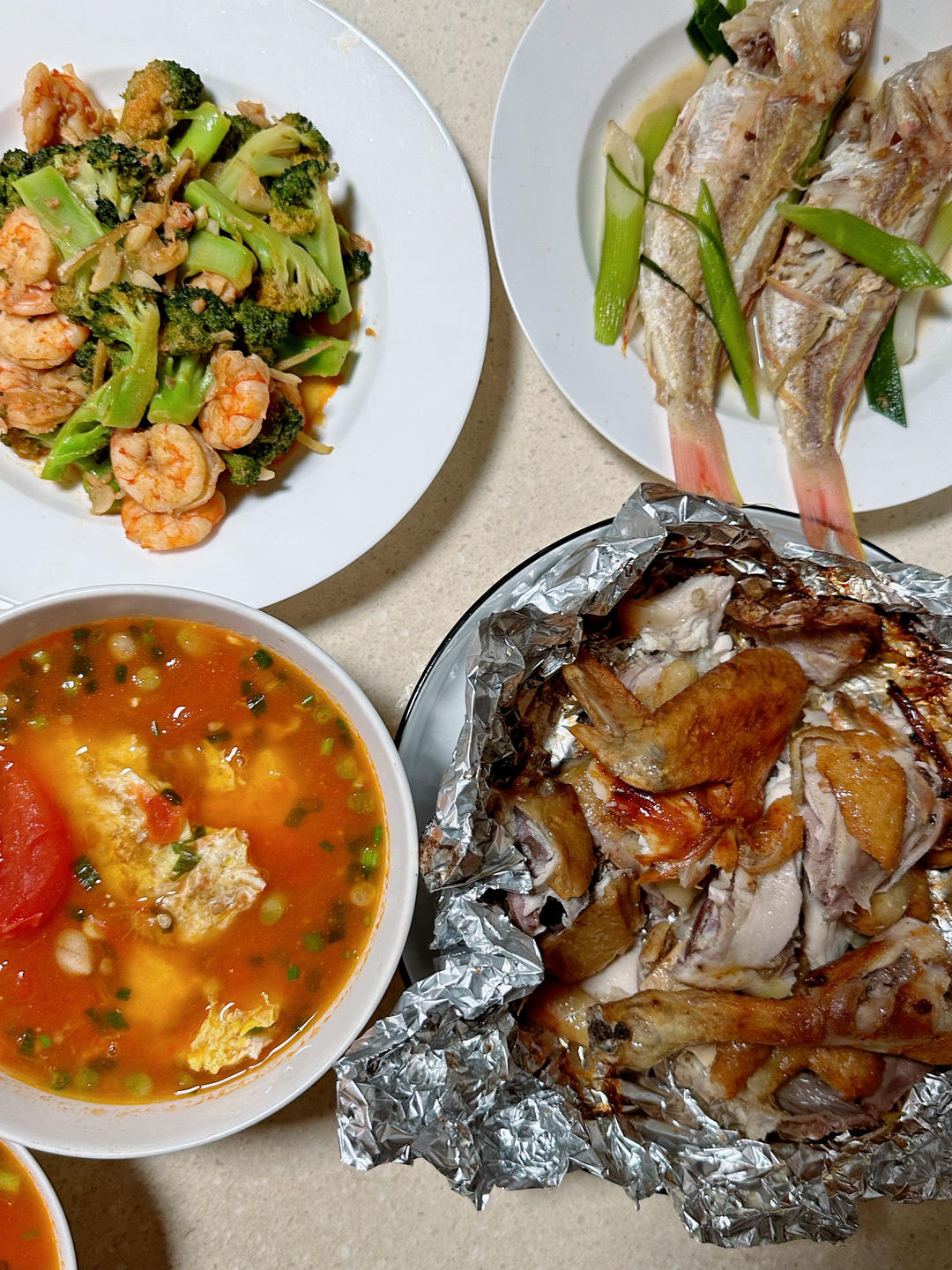 西红柿鸡蛋汤,鱼,烤盐焗鸡,虾仁西兰花